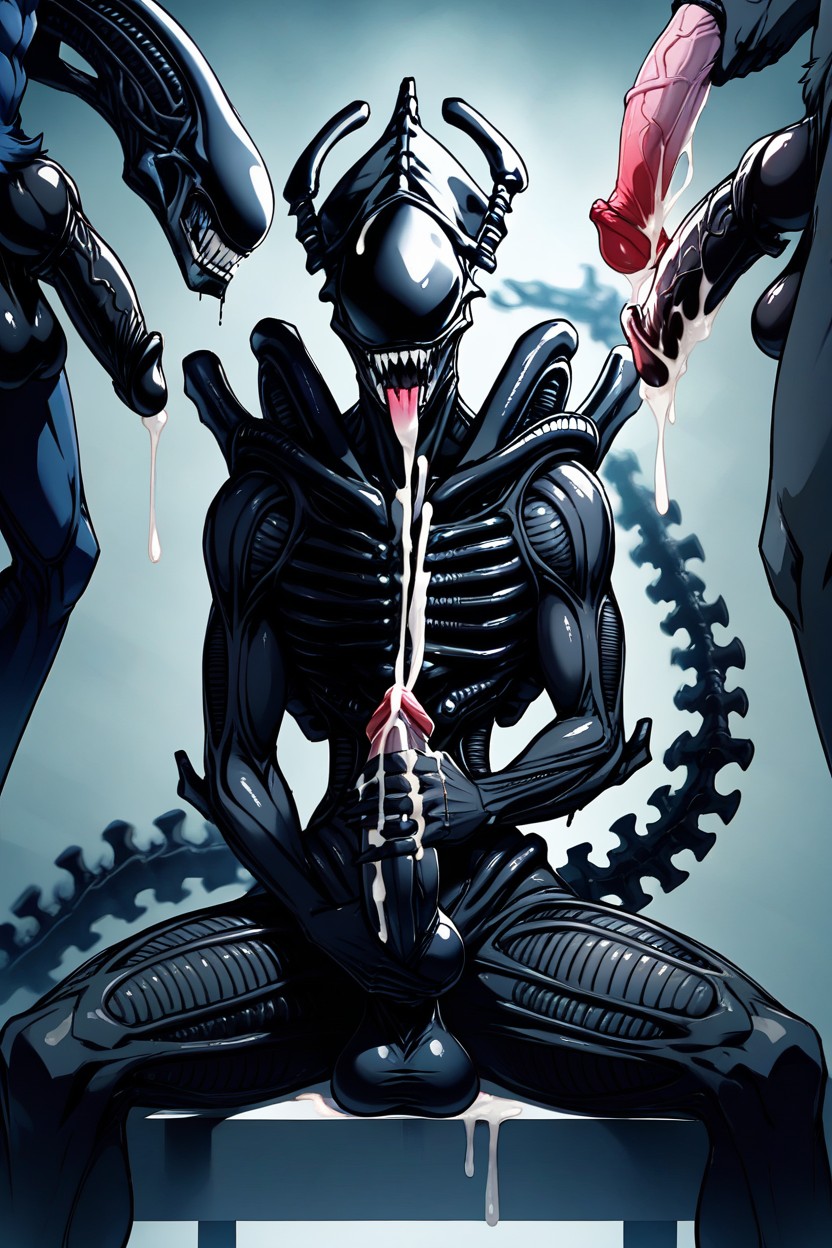 The Xenomorph Queen's Two Penises Are Pumping Out Her Hyper Cum Loads, Masturbation, Transgender Xenomorph Queen With Tits Shemale AI Porn